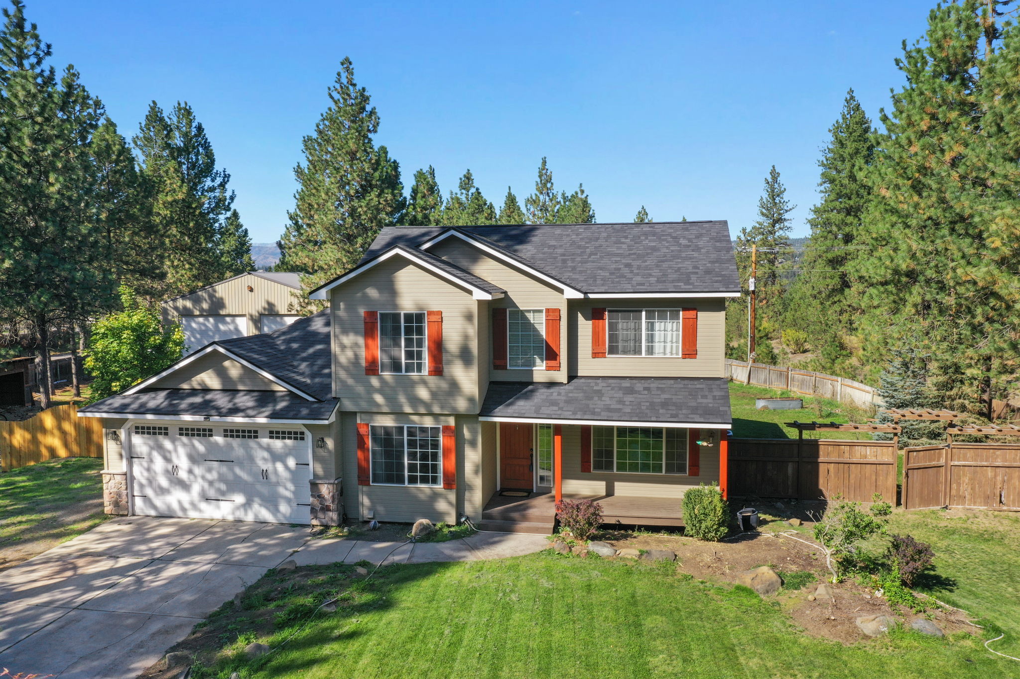 Wake up to quiet mornings on your own acreage, with trees, garden beds, and birdsong instead of traffic. Start the day on the covered front porch with a cup of coffee, then move through slate-floored spaces that suit daily life—cooking in the updated country kitchen, sharing meals in the dining room, or relaxing under the warmth of a vaulted knotty pine ceiling. A second family room downstairs naturally fits movie nights, gaming, or hobbies, keeping activity separate from the main level. Step out onto the expansive back deck where much of your summer living can happen outdoors, with grilling, gathering, and views over a private yard and garden spaces. The 40'x50' RV shop and outbuildings support a lifestyle with boats, RVs, tools, and projects. With Westshore Association access, it is easy to launch onto Lake Spokane, spend time at the dock and picnic area, and be back home in minutes, enjoying both a slower pace and an active lake life.